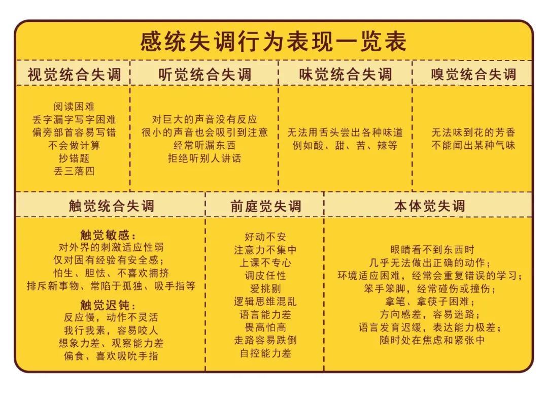 感统失调的表现还要从视觉、听觉、味觉、嗅觉、触觉、前庭觉和本体觉这七个感官上的失调表现说起,我将这些表现整理成了一张表格,以便大家对照。